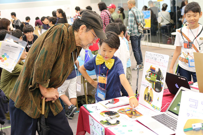 会場内には、多くの子どもたちが自分の作品が展示されているスペースもあり、訪れた子どもや大人に子ども自ら説明(プレゼン)を行いました。
