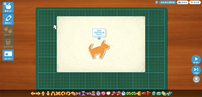 イヌの上に「ココにプログラミンをドラッグ!」という表示がありますよね。