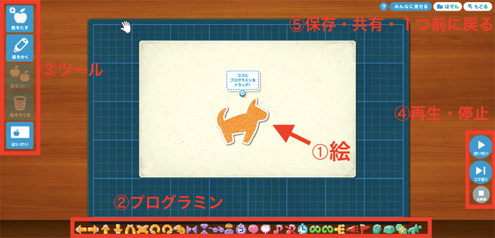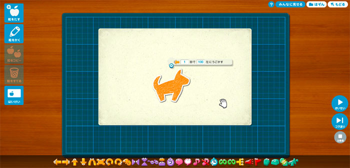 基本的には「Scratch」によく似たつくりになっていて、むしろScratchよりも日本の子ども向けに作られています。