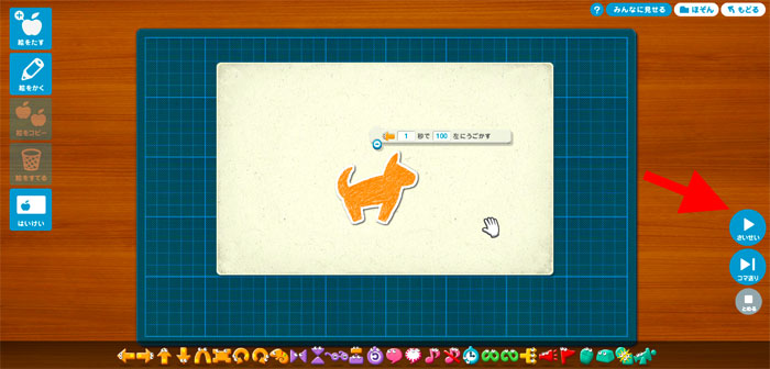できあがったプログラムを実行する時には、右側にある「さいせい」ボタンを押します。