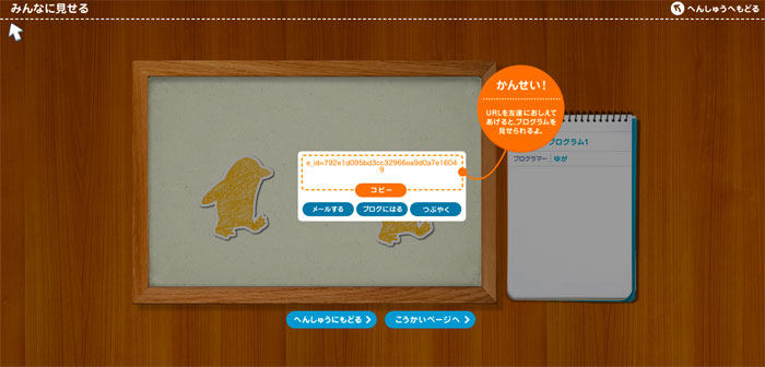 このURLをコピーして、TwitterやLINEなどで友だちに送ることでお互いの作品を見せ合いっこすることができるのです。